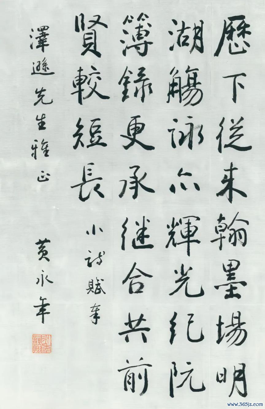 我还写信给黄先生要了一幅字,事理是搬了新家(山大第五寝室二号楼)。黄先生很清翠地作了一首诗,写成条幅带来了。本体过录如下:“历下从来笔墨场,明湖觞咏亦辉光。纪阮簿录更承继,合共先哲较短长。小诗赋奉泽逊先生雅正。黄永年。”下钤“永年词章”朱文方印。时期虽然是2001年3月。
